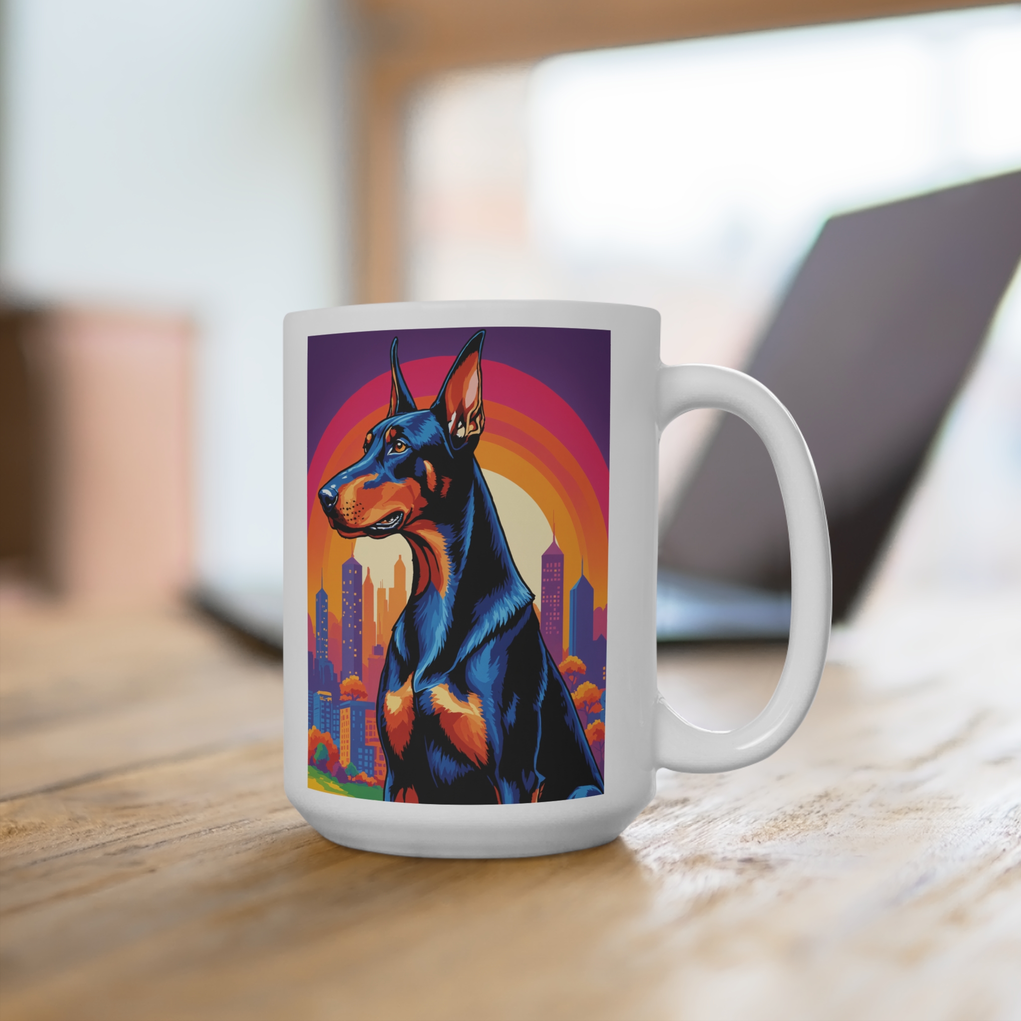 Bright and bold, this Doberman Pop Art city ceramic mug brings alleyways and neon nights to your morning coffee. Colorful pop-art panels wrap all the way around the white ceramic body, catching light and attention from every angle. The large C-handle feels steady in your hand as you cradle a warm brew, and the rounded corners give it a softer, modern silhouette. Built for everyday use—dishwasher and microwave safe—this cup keeps its vivid colors while standing up to routine. It reads like a little urban story on your counter: a loyal Doberman silhouette against city shapes and splashes of saturated color, the kind of cup that sparks a smile between sips and fits right into mornings, late-night study sessions, and slow weekends at home.